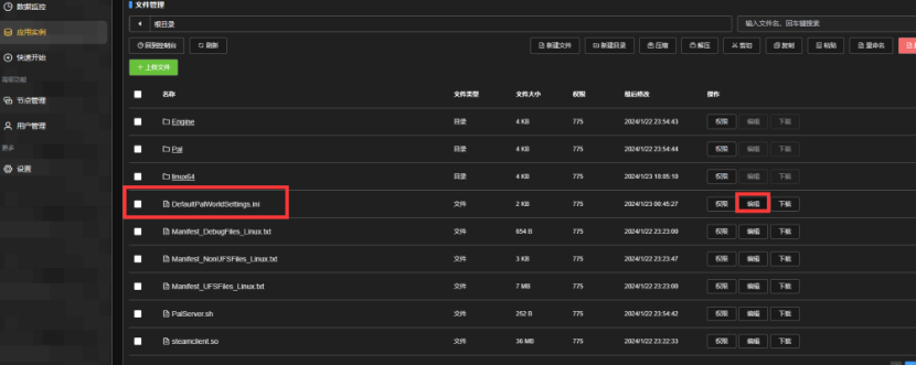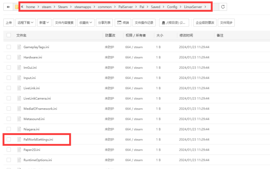 将DefaultPalWorldSettings.ini内的内容复制到Pal/Saved/Config/LinuxServer/PalWorldSettings.ini上,并修改里面的参数。